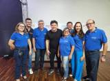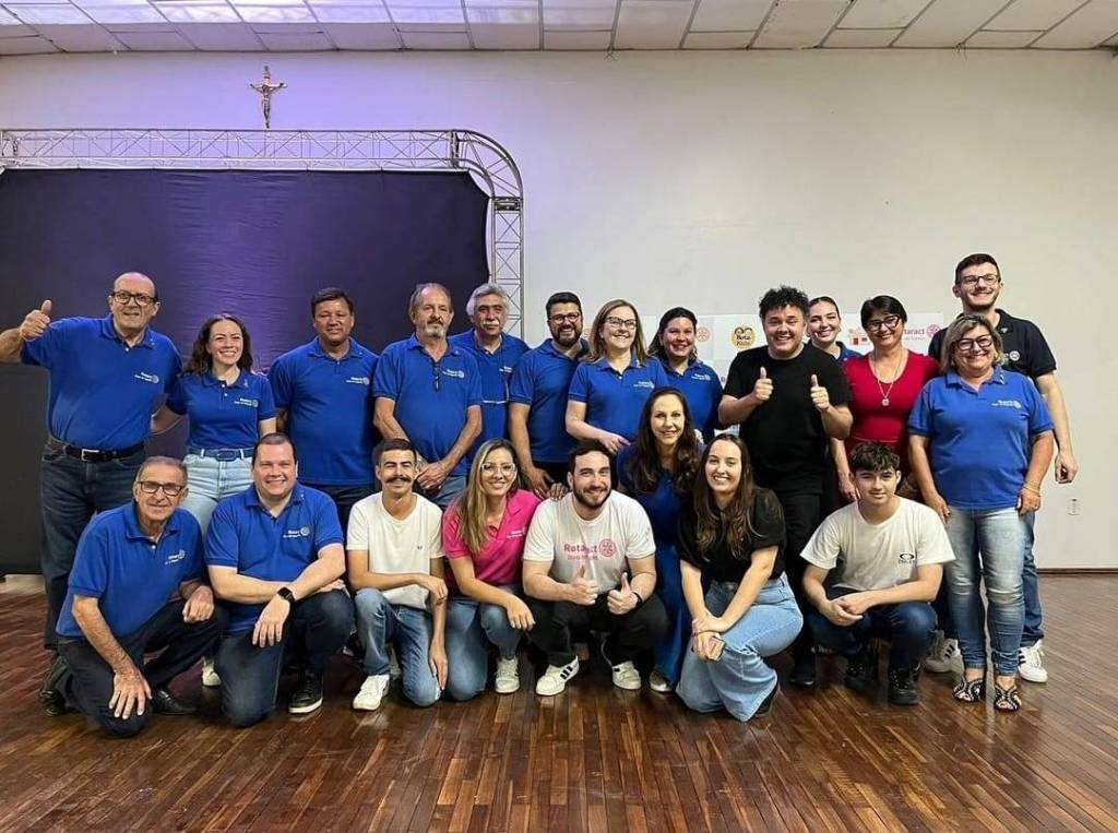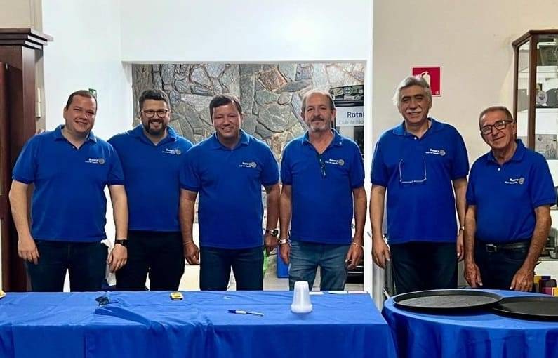 Foto com oito pessoas, sendo cinco homens e três mulheres. Todos estão sorrindo e apenas dois rapazes vestem camiseta preta, o restante veste camiseta azul do Rotary. O lugar é fechado, com piso amadeirado, paredes claras ao fundo e na lateral esquerda existe uma estrutura de alumínio do chão ao teto acompanhado de um tecido preto e no chão um foco de luz. Atrás das pessoas observamos um painel pequeno escrito.