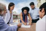 Foto com cinco pessoas em volta de uma mesa, sendo que duas mulheres e um homem estão de pé e de frente e um homem e uma mulher estão sentados e de costas para o clique. A jovem que está no centro da foto de frente tem sobre a mesa um grande papel branco e usa uma caneta para anotar algo nesta superfície enquanto os outros a observam. É dia, o lugar é aberto podendo nos mostrar o céu azul com nuvens. Ao fundo observamos construções térreas na lateral esquerda e sobrado na lateral direita.