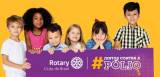 No cartaz roxo em frente às crianças, à esquerda, está o texto "Rotary Clubs do Brasil" acompanhado do logotipo do Rotary, que é uma roda dentada. À direita, em letras grandes, está escrito "# Juntos Contra a Pólio", com a palavra "Pólio" destacada em branco e amarelo.