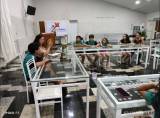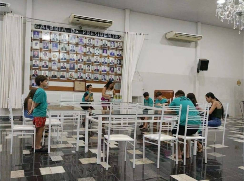 A imagem retrata uma reunião do Interact e Rotary Kids de Santa Fé do Sul, realizada em uma sala ampla e bem iluminada. No centro da sala, há várias mesas de vidro dispostas em formato de "U", ao redor das quais estão em pé cerca de doze crianças e adolescentes. A maioria deles veste camisetas verdes com o logotipo do Interact estampado no centro, que é colorido e vibrante.
