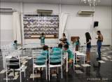 À direita da imagem, uma menina usa um vestido azul claro com detalhes nas costas. No lado esquerdo, próximo a um púlpito de madeira, há uma pessoa parcialmente visível, possivelmente um adulto, que parece estar conduzindo a reunião. Atrás do púlpito, um quadro branco exibe um desenho colorido, que pode ser um símbolo ou logotipo relacionado ao evento ou à organização.