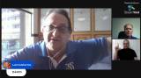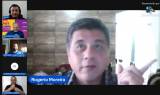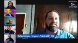 Foto de uma tela de computador onde uma reunião on-line acontece. Em primeiro plano e em espaço maior temos a imagem de um jovem rapaz de barba desenhada, com cabelos presos e vestindo camiseta polo azul. Atrás dele um móvel de madeira escura.