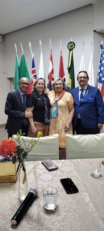 Foto com dois casais sorridentes: na direita destacamos o casal Gov do Distrito Éder Bocchini e Nelly; os homens vestindo terno escuro e as mulheres esporte social.
